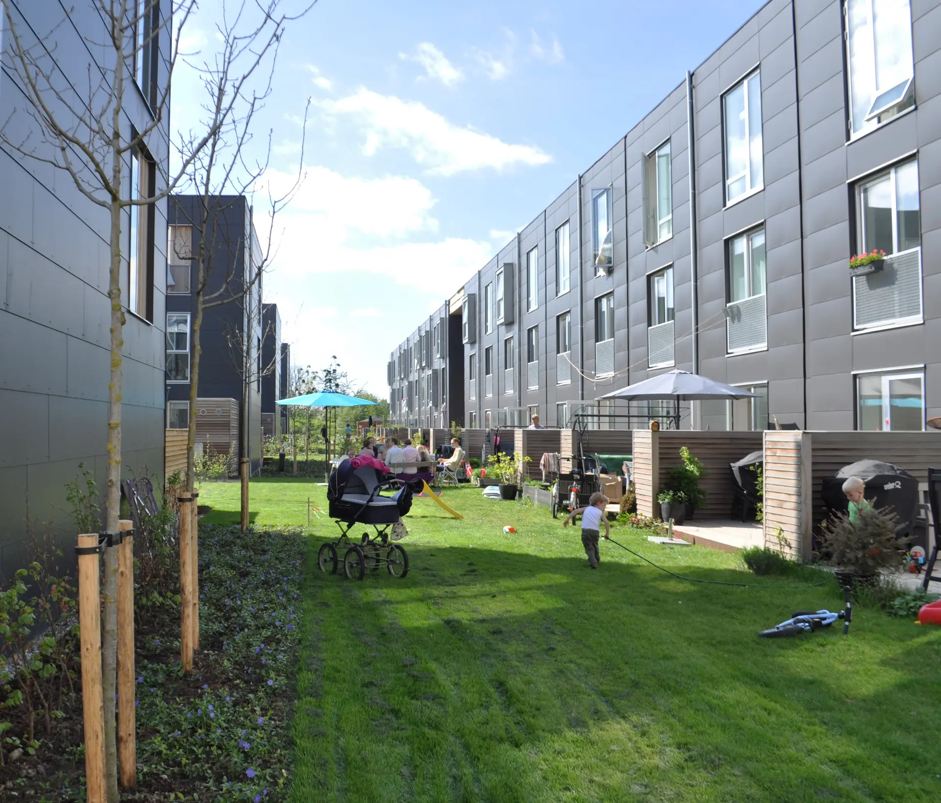 What immediately stands out is the absence of hard boundaries. Front gardens flow into shared courtyards. Benches replace railings. Privacy is created by planting, level changes, and distance — not by walls or fences.